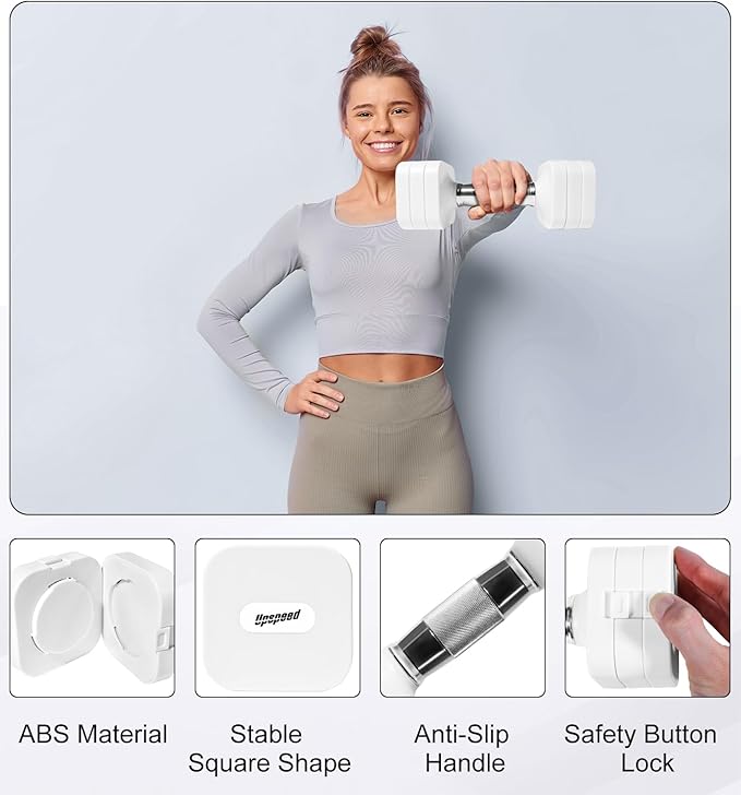 • The weights dumbbells set are square and not round. The square shape keeps them from rolling around on the floor or shelf. The handle boasts anti-slip strips to provide better gripping.