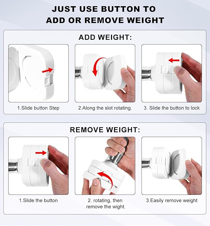 • The mechanism to connect and disconnect the additional weighted pieces are simple to use and twist into place, can be quickly to adjust for more or less weight.