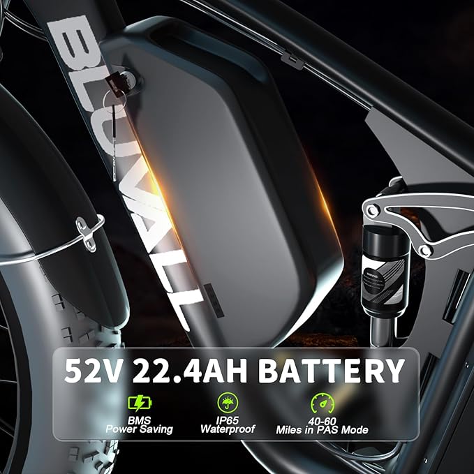 - Battery Assist to Defeat Fatigue: The 26" fat tire electric bike is equipped with a detachable 52V 22.4Ah battery, offering a range of 60-90 miles with pedal assist and 55-75 miles on pure electric power.