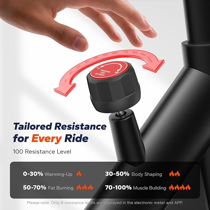- INFINITE RESISTANCE FOR YOUR WORKOUTS: You can adjust the resistance to any level, from light rides to intense climbs on this spinning exercise bikes. This 0-100% resistance variation caters to the daily workout needs of individuals across different fitness stages. **Please note, you'll only see 8 resistance levels displayed on the display