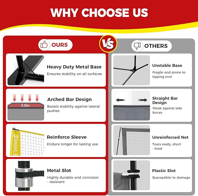 - Professional-Grade Stability: Our volleyball net features a heavy-duty square metal base for extra stability and anti-tip protection. The powder-coated steel frame resists rust in all weather. Its 5-ply net is tear-proof, withstanding powerful spikes. 16mm thick fiberglass poles endure intense uses, absorbing impacts to prevent damage, ensuring long-lasting performance