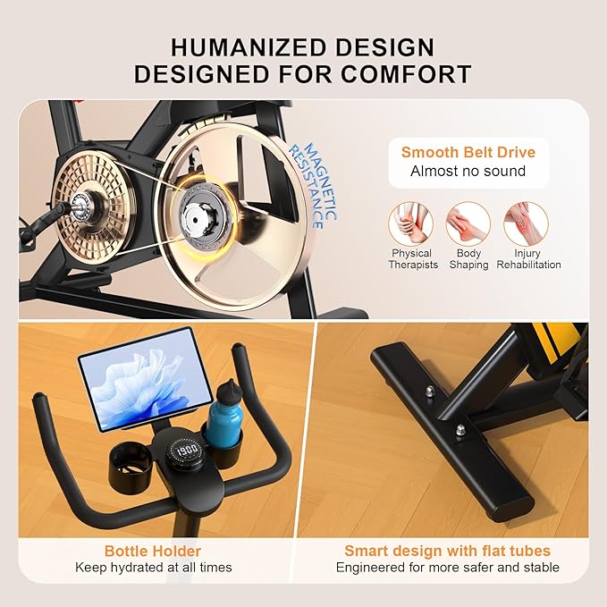 - Smooth, Stable & Comfortable Ride: Crafted with a heavy-duty steel frame and 13 lbs flywheel, this stationary exercise bikes delivers a smooth, quiet, and stable ride—ideal for home use without disturbing others. Designed for all fitness levels, it features adjustable resistance, a multi-grip handlebar, shock absorption for added comfort, and safety-enhancing cage pedals with an instant stop bar. Dual water bottle holders and built-in transport wheels make every workout safe, convenient, and effective.