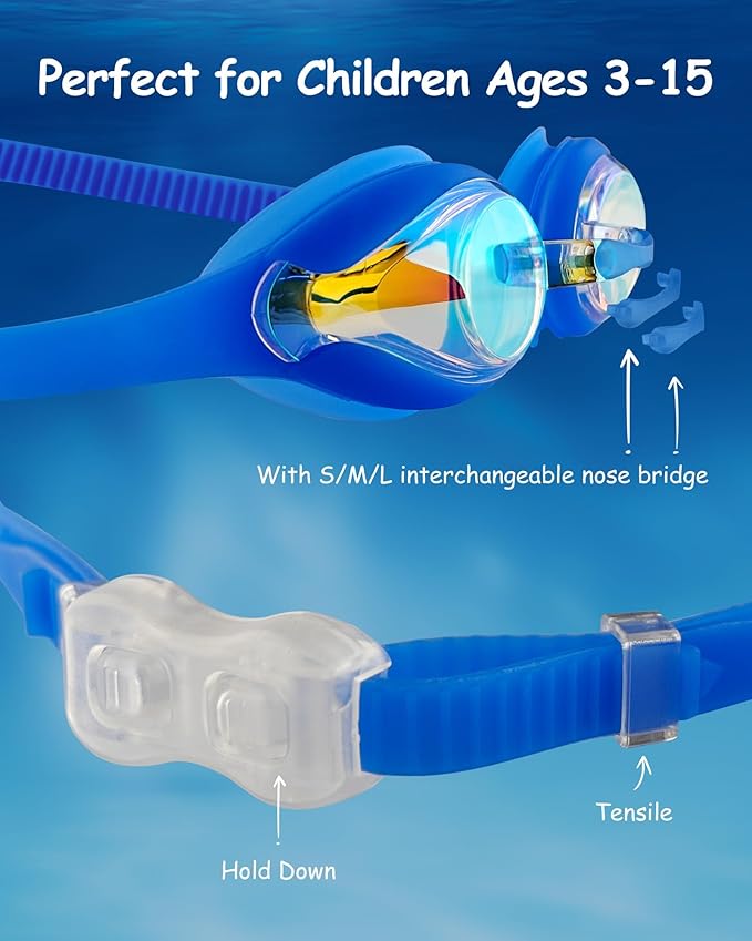 - Interchangeable Nose Bars: This kids swim goggle includes 3 interchangeable nose bars to fit different nose shapes, ergonomically designed to ensure every child's comfort, so every child can find a goggle that fits his or her nose.