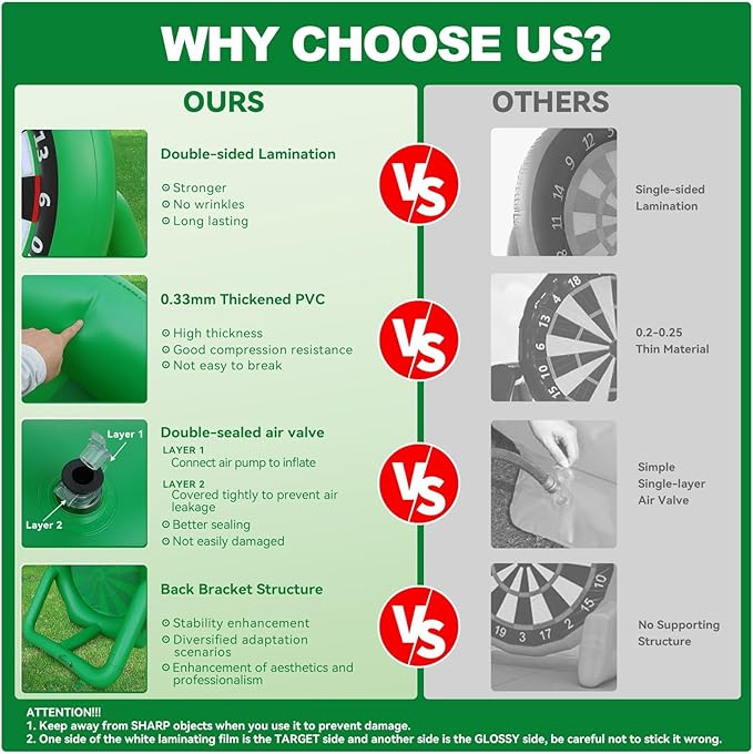 - Excellent Manufacturing Process: Inflatable dart board is made of premium-quality PVC material, which can accompany you for many years, and gives you a pleasant backyard dartboard game experience.