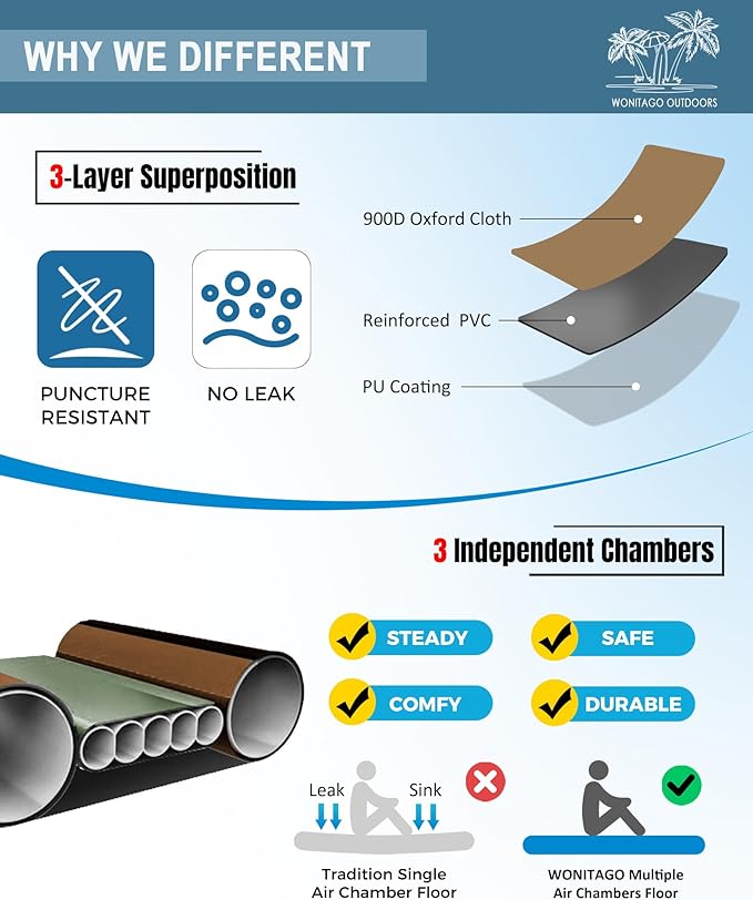 - ENJOY COMFORT JOURNEY --- This inflatable travel kayak's floor can provide comfortable support and flat surface, paired with our inflatable seat cushion, provides better support for your waist. It's ideal for excursion along the river to enjoy the scenery