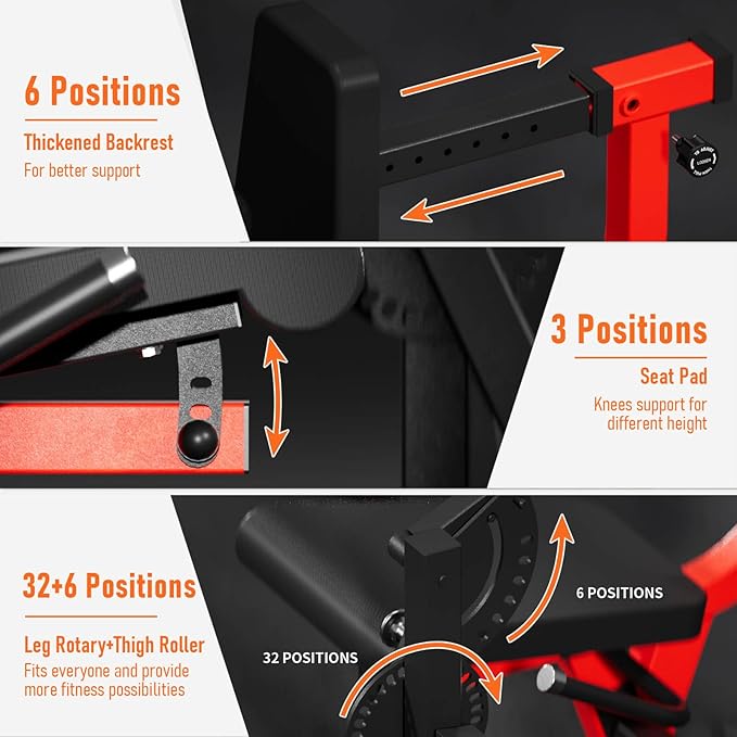 - Adjustable: 6-position adjustable thigh roller, 32-position adjustable rotary leg extension, 6-position adjustable thickened backrest pad, and 3-position adjustable seat pad, ensures proper alignment & engagement of muscles throughout each repetition & suits your body for comfort