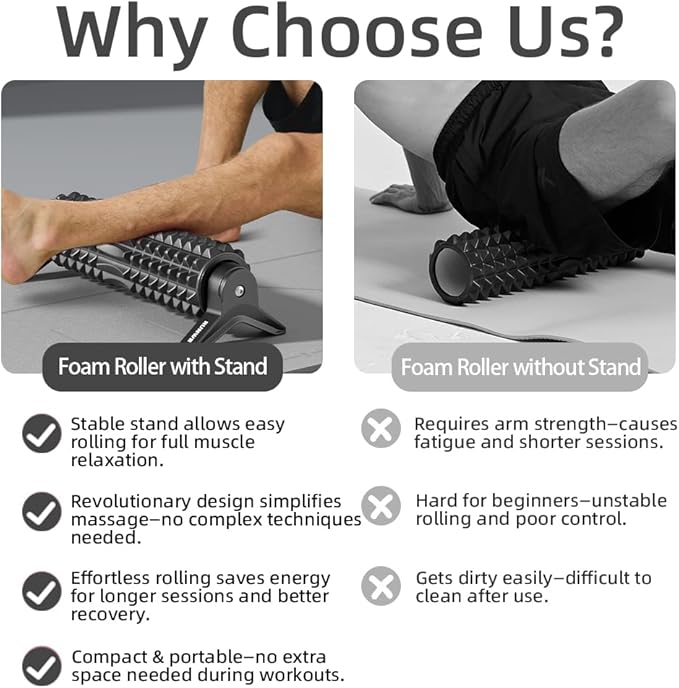 - 2025 Upgraded Foam Roller with Fixed Non-Slip Stand: No Assembly Needed! Unlike other grid foam rollers that roll away, our built-in stand keeps it stable right out of the box. Just place it down and roll! A foam roller with a fixed stand is more stable than standard foam rollers¡ªno slipping or chasing during use, making massage easier and more efficient. Perfect for beginners or SMALL SPACES, it offers hands-free convenience and better control.