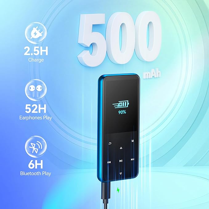- 【Multi-function & Long battery life】 M3 MP3 player with Music Play, Video, Recording, Radio, Pictures, e-Books, Pedometer, A-B repeat, etc. Built-in 500mAh battery, it only takes 2.5 hours to fully charge and enjoy long hours of music. Perfect solution to replace mobile phone music, save mobile phone power and extend mobile phone battery life.