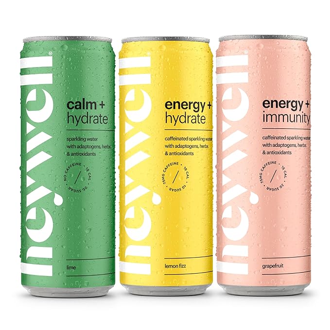 - VARIETY PACK – Lime, Lemon Fizz & Grapefruit Flavor This Heywell variety pack includes two refreshing flavors designed to support energy, focus, immunity, and stress relief. Lightly sparkling with just 10 calories and 1g sugar, these adaptogen drinks are made with organic ingredients, electrolytes, and are Non-GMO, Vegan, Gluten Free, and alcohol-free—perfect as a functional mocktail or daily boost.
