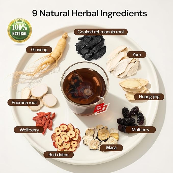 - Natural Herbal Ingredients:Ginseng tea contains Huang jing, Maca, Wolfberry, Red dates, Yam, Mulberry, Cooked rehmannia root, Pueraria root, Ginseng (artificially grown for 5 years and less), according to the traditional recipe, without any artificial additives or chemicals, you can eat the ingredients with peace of mind.