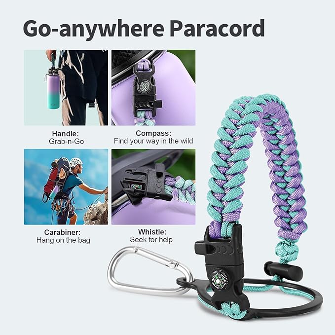 - Palm Fitting Paracord Handle: Compared to handle lids, nylon paracord on the bottle gives you more choices in terms of color coordination and coziness on your hands. Match the handle with your bottle to make a complete outdoorsy look. Compass and carabiner can be lifesavers for hiking and other expeditions