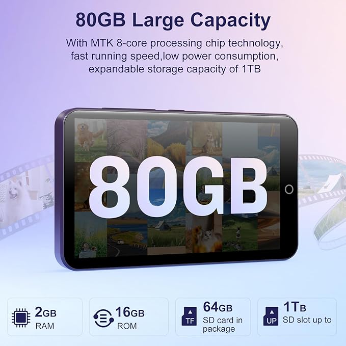 - 【80GB Large Capacity】Our spotify music player built in 2GB RAM and 80GB storage(16GB ROM+ 64GB TF card), supports to expand external storage up to 1TB, which can easily hold thousands of music, this can greatly satisfy your need to store more songs, videos, audiobooks.