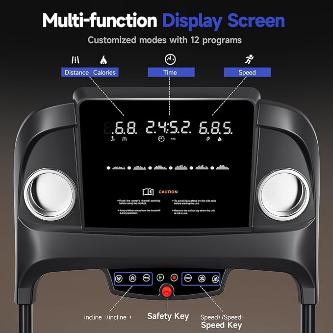 - 【HUGE WINDOWN DISPLAY】The 16 Inch multi-function LED screen of folding treadmill clearly displays time, speed, distance and calories to accurately track your exercise performance. This treadmill with handles have P-button 12 preset programs and countdown modes provide different intensities of exercise and you can choose customized one with ease.