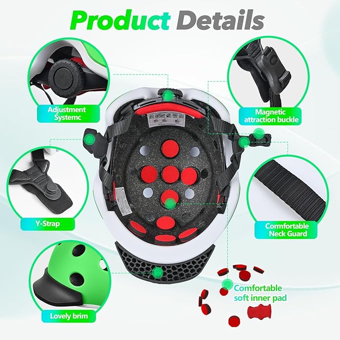 - 【INNOVATION UPGRADED - MAGNETIC BUCKLE】Kids skateboard helmet adopts an innovatively developed magnetic buckle, which changes the traditional plug-in method and can be operated with one hand. The super strong suction can fit instantly and lock firmly, which is convenient to use while ensuring safety performance.