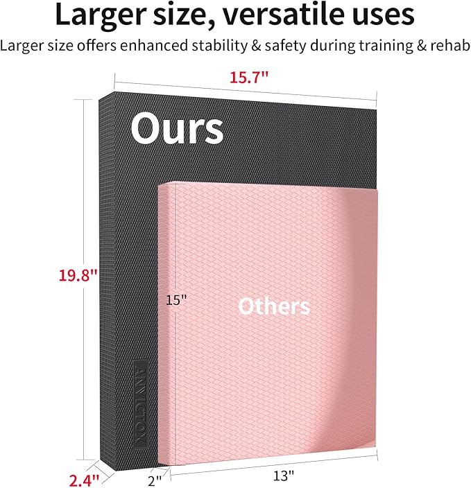 - [Extra Larger Size&Versatile Use]19.8*15.7*2.4inch.Larger balance pads provide a larger support area, making people more stable and safe during training or rehabilitation. It can also better train body muscle control and balance, enhancing body stability and coordination. Large balance pad usually has better anti-slip performance, offering better support and protection. They are suitable for users of different heights and body types, better meeting their needs