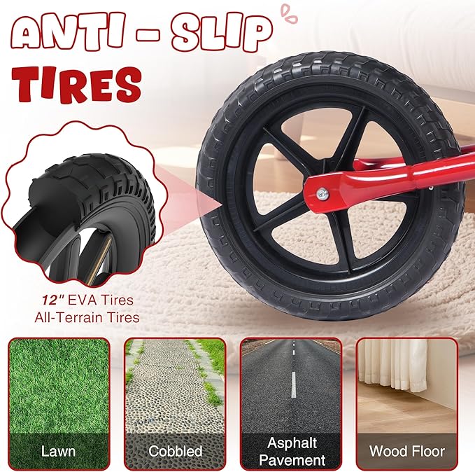 - Multi-Terrain Use Tires: Equipped with durable 12 inch EVA tires, this balance bike can easily navigate various surfaces, such as asphalt pavement, lawn, cobbled, and wood floor, making it perfect for adventures.