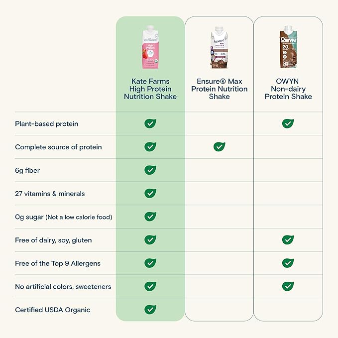 - Crafted to meet the Kate Farms Standard: Our promise for honest goodness. Every shake is plant-based, Certified USDA Organic, and Non-GMO Project Verified. It’s made without dairy, soy, gluten, or the top 9 common allergens, and contains no artificial colors, sweeteners, or flavors. We also leave out corn syrup and carrageenan—because real nutrition should be simple and trusted.