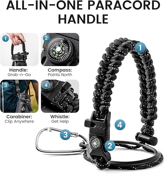 - Adventure Ready Paracord Handle: RAYMYLO 1 gallon water jug features a stylish color-coordinated paracord handle with a built-in compass and carabiner clip. This reusable water bottle's paracord handle is lightweight, durable, and perfect for hands-free carrying during hikes, cycling, or camping. Grab & go for spontaneous adventures under the stars!