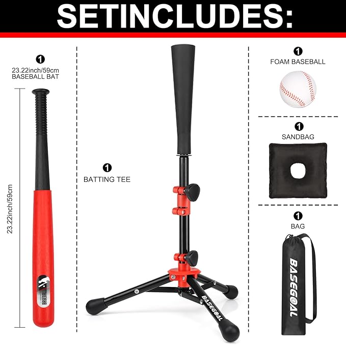 - 4.【ALL INCLUDED】This set comes complete with the Batting Tee, (1) 23 inch plastic bat,1 baseballs, and Sandbag (sand not included) by attaching it to base for extra stabilization if needed, providing you with everything you need to play!