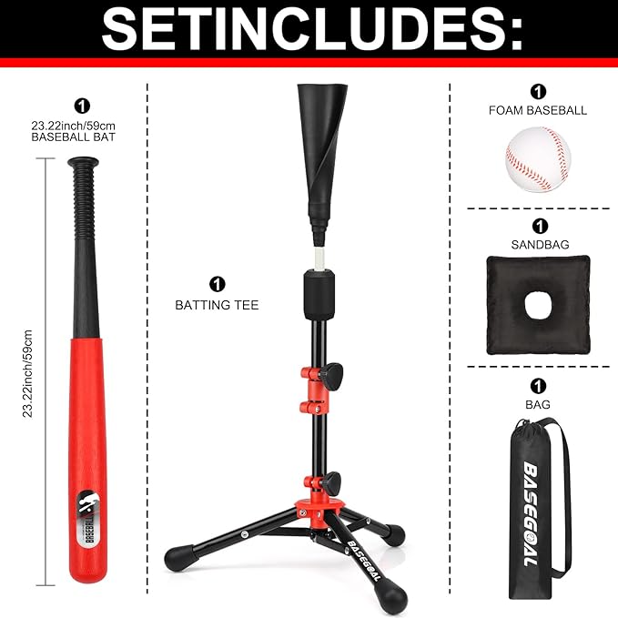 - 4.【ALL INCLUDED】This set comes complete with the Batting Tee, (1) 23 inch plastic bat,1 baseballs, and Sandbag (sand not included) by attaching it to base for extra stabilization if needed, providing you with everything you need to play!