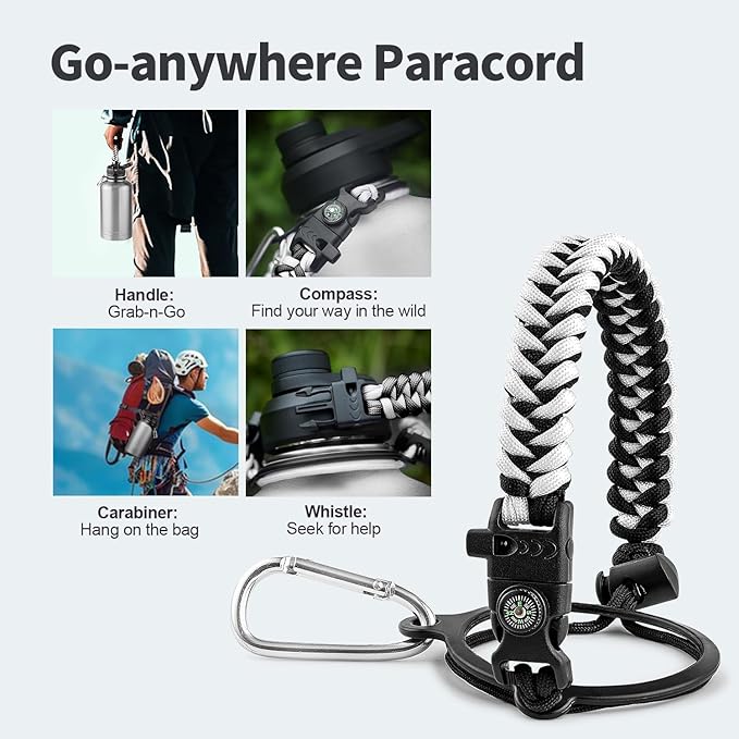 - Palm Fitting Paracord Handle: Compared to handle lids, nylon paracord on the bottle gives you more choices in terms of color coordination and coziness on your hands. Match the handle with your bottle to make a complete outdoorsy look. Compass and carabiner can be lifesavers for hiking and other expeditions