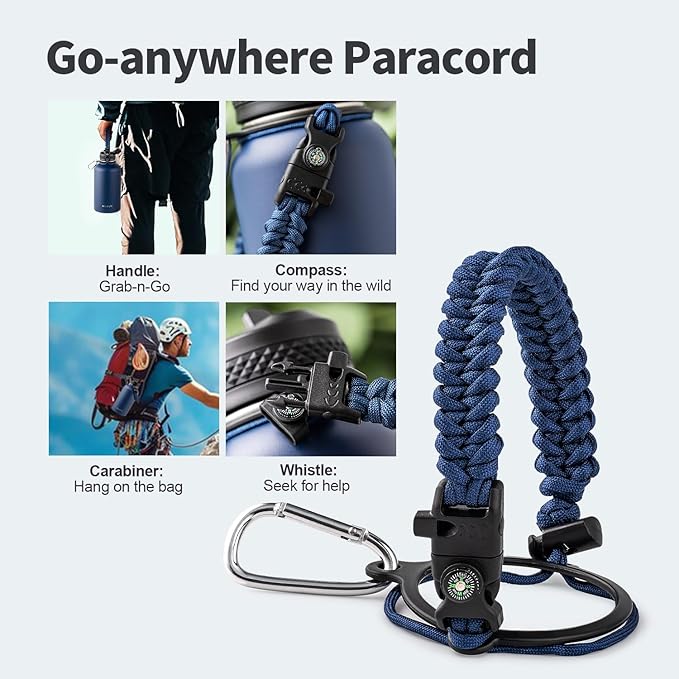 - Palm Fitting Paracord Handle: Compared to handle lids, nylon paracord on the bottle gives you more choices in terms of color coordination and coziness on your hands. Match the handle with your bottle to make a complete outdoorsy look. Compass and carabiner can be lifesavers for hiking and other expeditions