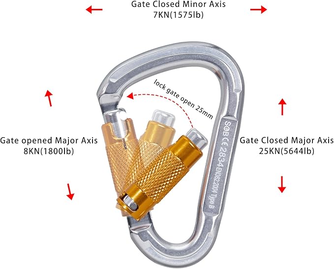 - 【CE Certification】Locking carabiner clips have passed the CE 2834 EN362 standard certification. The long axis of each clasp is designed for a breaking load of 25KN (5644lb), the smaller axis for a breaking load of 7KN (1575lb), the unlocking breaking load for 8KN (1800lb).