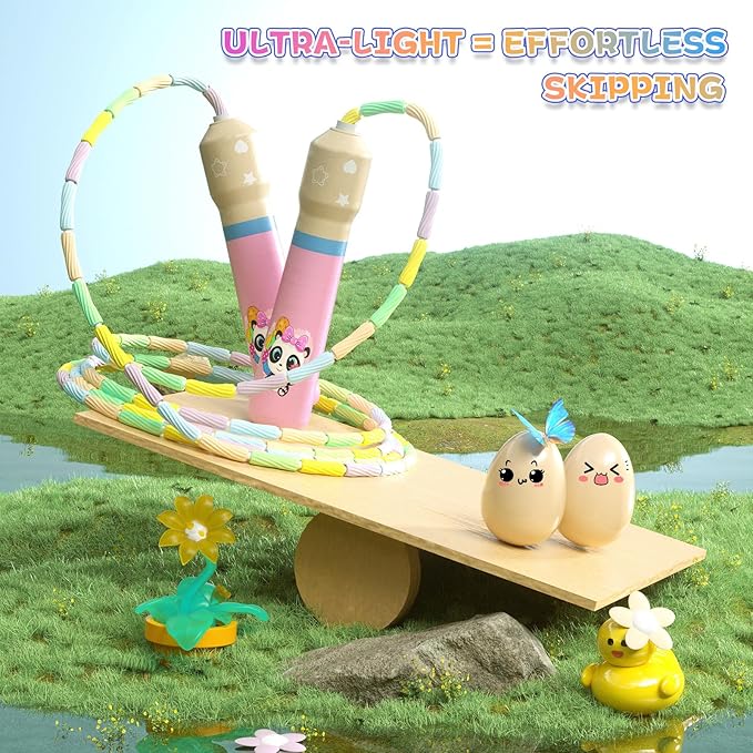 JGM Beaded Jump Rope for Kids – Adjustable Toddler Skipping Rope with Cartoon WOODEN Handle for Outdoor Activity Party Favors School Games 7.7 Feet
