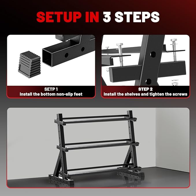 - Setup in 3 Steps: Our 3-tier dumbbell rack has been improved, simply attach the non-slip rubber feet and place the shelves onto the frame. No complex tools or lengthy setup required. Enjoy immediate, space-saving storage with enhanced stability and floor protection.