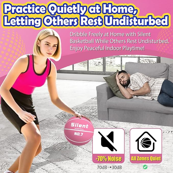 2025 Upgraded Silent Basketball Size 7 - Indoor Noiseless Airless Foam Basketball, Quiet Dribble Dream Training Ball with Soft Soundless Bounce-Pink