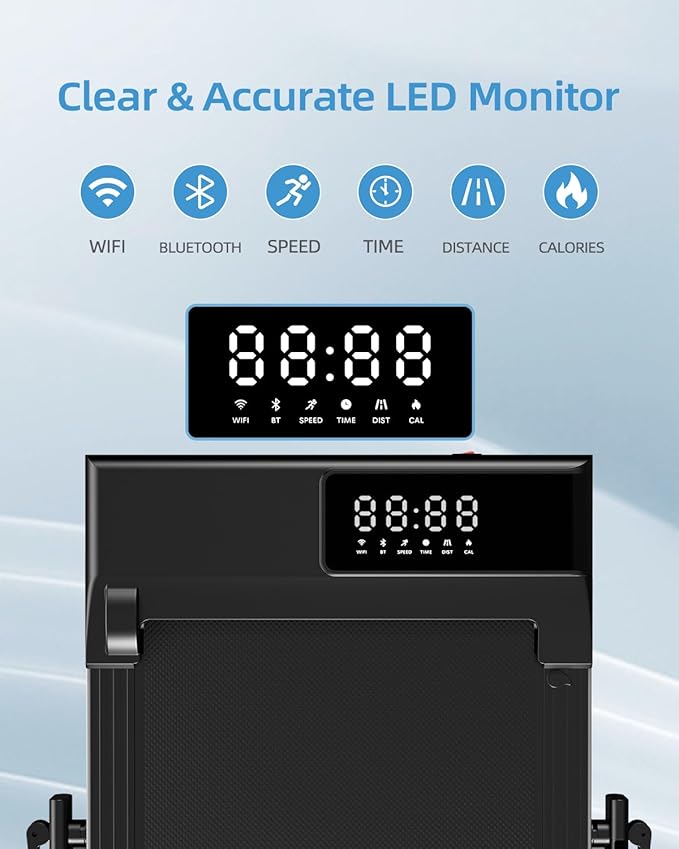 - Smart APP & LED Display: The mini treadmill features a smart APP for recording exercise data and offers virtual simulations, multiplayer connectivity, team races and rewards, enhancing workouts with interactive features and friendly competition. Even without using the APP, the small treadmill's LED display can track real-time exercise metrics such as time, speed, distance, and calories burned